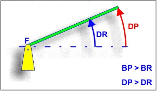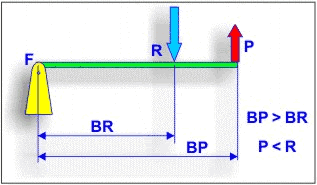 Esta disposición hace que los movimientos de la potencia y de la resistencia se realicen siempre en el mismo sentido, pero la carga siempre se desplaza menos que la potencia (DR<DP), por tanto es un montaje que atenúa el movimiento de la potencia.