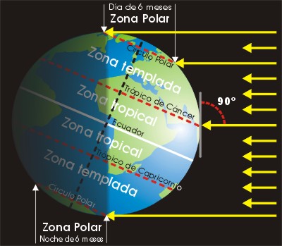 Como ya mencionamos, debido a la curvatura de la Tierra la insolación varía, lo que ocasiona diferencias en el clima y el paisaje geográfico. Los trópicos y los círculos polares, marcan la división del globo terrestre en cinco zonas astronómicas . Si hacemos el cálculo por hemisferio, tenemos tres zonas en cada uno: