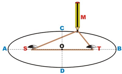 La elipse puede trazarse colocando unas "chinchetas" fijas en S y T y pasando un cordel un poco más largo por las dos "chinchetas". Después pasamos el lápiz M, de tal modo que el cordel se mantenga tenso, mientras vamos dibujando la elipse. |